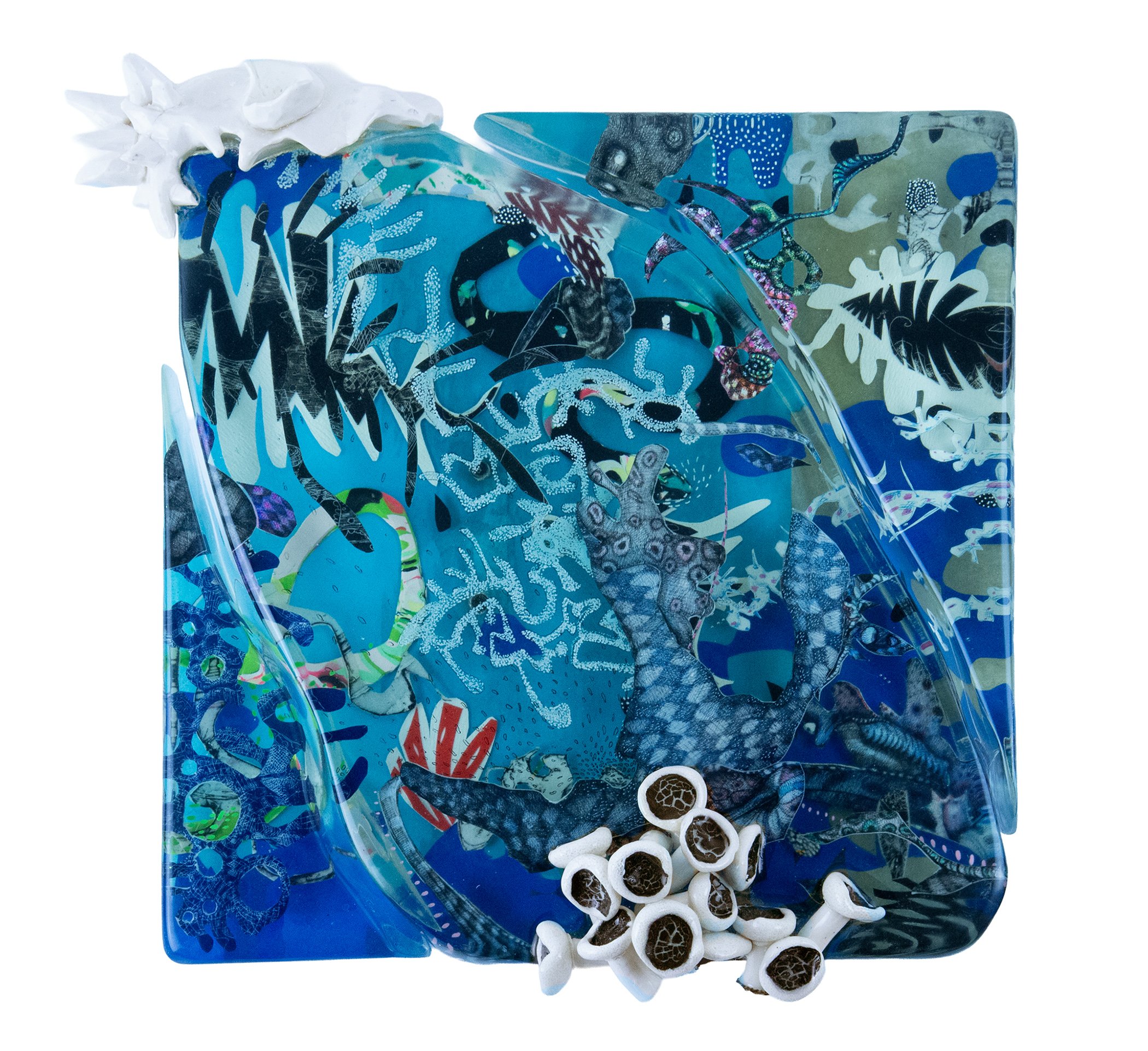 Memory of Water | 2025 | Mixed media: resin, ceramic, ink, paper | 14" × 14" × 2"